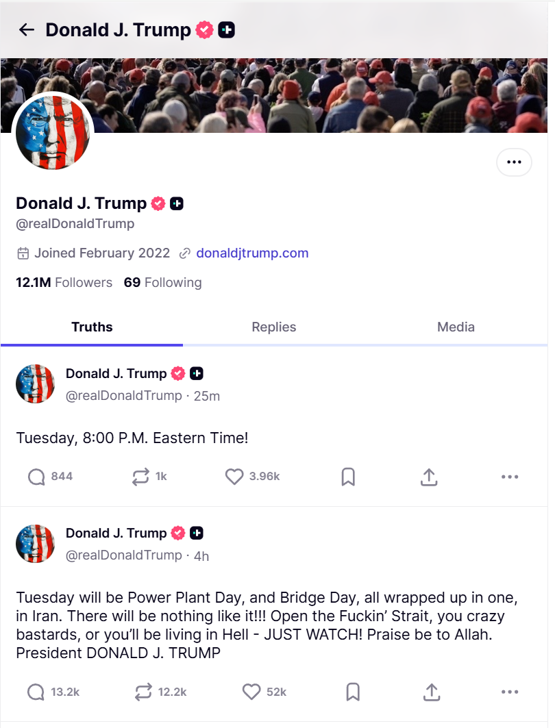 Nel mirino del leader americano ci sono centrali elettriche e ponti, con un possibile intervento militare già fissato nei prossimi giorni. «Martedì in Iran sarà la Giornata della Centrale Elettrica e la Giornata del Ponte, tutto in uno. Non ci sarà niente di simile!!! Aprite il maledetto Stretto, pazzi bastardi, o vivrete all'inferno - VEDRETE! Sia lode ad Allah», ha scritto sul social Truth.