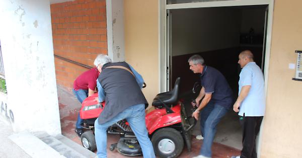 I residenti aiutano i responsabili della parrocchia a portare via il tagliaerba