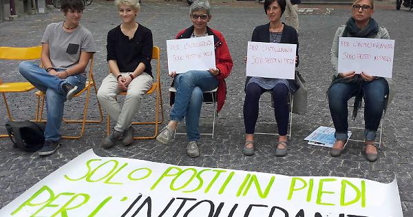 "Per l'intolleranza solo posti in piedi". Con questo cartello Elisabetta Ballurio, Presidente del Consiglio Comunale si Ivrea ha preso una sedia, ed insieme ad una manciata di persone (tra cui Lisa Gino del gruppo "Viviamo Ivrea" e la figlia Francesca) si è piazzata di fronte alle Sentinelle in Piedi, in piazza di Città. Perché ad Ivrea, come in tante altre città italiane, le Sentinelle in Piedi, hanno organizzato nel pomeriggio di sabato 23 maggio una "veglia": tutti immobili, in piedi, leggendo un libro, una rivista o il vangelo, per esprimere una netta contrarietà alle unioni civili fra omosessuali.