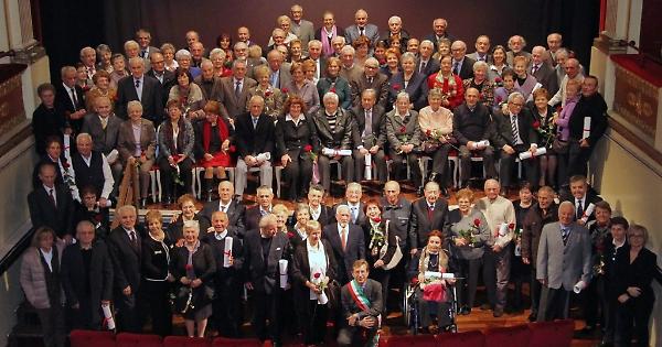 Anche quest'anno l'Amministrazione Comunale ha omaggiato le coppie della città che hanno raggiunto il traguardo dei cinquant'anni di matrimonio. L'inconro si è svolto come di consueto al Teatro Giacosa nella mattinata di sabato 30 novembre. Il Sindaco Carlo Della Pepa e il Presidente del Consiglio Comunale Elisabetta Ballurio hanno omaggiato i festeggiati. Nello e Gisella ROVERETO 01/09/1963 Bruno e Romano Giovanna Francesca LAMBORGHINI 19/01/1963 Teofilo e Margarita Corina PALACIOS CABRERA 19/01/1963 Ireneo e Anna MUCELLI 02/03/1963 Gianfranco e Maria MARCON 23/02/1963 Attilio e Giovanni Silvana MORELLO 15/04/1963 Primo e Graziella Guerrina SACCUMAN 23/03/1963 Lino e Maria Cristina NAJ FOVINO 18/04/1963 Pietro e Giuseppa MENDOLA 25/04/1963 Paolo Glauco e Rosina CASARSA 28/04/1963 Salvatore e Antonia SPINGOLA 28/04/1963 Angelino e Fernanda Caterina PARNISARI 04/05/1963 Serafino e Dolores VOLA 05/05/1963 Luciano e Amalia BONA 12/05/1963 Bruno Luigi e Lucia Natalina GIACOMETTI 18/05/1963 Sergio Quinto e Rosanna Graziella IBERTI 18/05/1963 Giulio Mauro e Rosanna Itala TOVO 18/05/1963 Severino Franco e Bruna Giuseppina CECCARELLO 19/05/1963 Aldo e Maria FRASCA 19/05/1963 Giovanni e Maria Carla BRAMBILLA 29/05/1963 Giuseppe e Maria Grazia FOGAROLI 30/05/1963 Alessandro Luigi e Maria Luisa BREVI 01/06/1963 Rodolfo Egidio e Liliana MUSSANO 01/06/1963 Gianfranco e Annamaria FACCIN 15/06/1963 Gianfranco e Ida ROMANO 30/06/1963 Giancarlo e Ettore Anna Maria DECAROLI 01/07/1963 Giuliano e Adriana Giovanna GILLIO 06/07/1963 Luigi Arduino e Franca Antonietta RUFFINO 14/07/1963 Claudio Giuseppe e Marina MATTIUSSI 14/07/1963 Vittorio e Camilla Pierina CERIA 21/07/1963 Raffaele e Alida Anna RIZZO 27/07/1963 Alfonso e Marianna DERIU 11/08/1963 Paolo e Rosa FRONS 14/08/1963 Pietro e Rosa RUSSO 24/08/1963 Nello e Gisella GASTALDO BRAC 07/09/1963 Francesco e Marco Maddalena Rosa SICCARDI 07/09/1963 Guido Felice e Maria Luigia FERRARIS 07/09/1963 Giovanni e Franca CUZZIOL 08/09/1963 Eli e Giuseppina MONALDI 12/09/1963 Egidio e Giuseppina Cesarina GIGLIO TOS 14/09/1963 Stefano e Alda Giuseppina MAZZUCCO 14/09/1963 Roberto e Sandra CAVALLERA 22/09/1963 Bruno e Giuseppe Adriana GIANOTTI 22/09/1963 Mario e Nadia CASSETTA 28/09/1963 Angelo e Rita ZARA 28/09/1963 Francesco Luigi e Maria Teresa MONTICELLI 05/10/1963 Bruno Marco e Maria Irene LANDORNO 19/10/1963 Franco Timoteo e Maria Giuseppina ENRIONE 26/10/1963 Otello Angelo e Carla Domenica FECCHIO 26/10/1963 Vito e Lucia COVIELLO 27/10/1963 Vincenzo e Maddalena BASILICATA 10/11/1963 Luigi e Giorgia Maria CALGARO 30/11/1963 Antonino e Adele PELLEGRINO 30/11/1963 Rosario e Graziana Margherita SANZA' 23/12/1963 Nicola e Eusapia ZARA 26/12/1963
