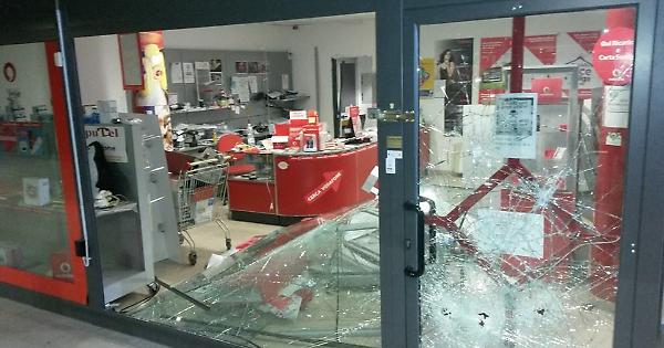 La vetrina in frantumi del negozio Computel di San Mauro