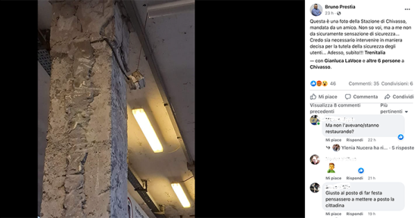 Il post di Bruno Prestìa dove si vede chiaramente la condizione di pericolo in cui versa una piglia della tettoia della stazione ferroviaria di Chivasso