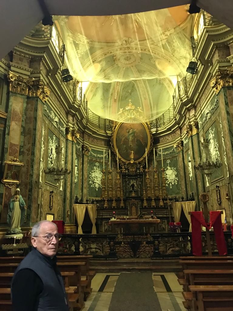 Era il 2 novembre 2017 quando entrando in chiesa, don Gino si accorse che dalla volta si erano staccati alcuni fregi: fortunatamente la chiesa era vuota, altrimenti sarebbe potuto accadere l’irreparabile. Senza perdersi d’animo, don Gino fece stendere una rete di protezione al di sotto di tutta la volta della chiesa ed iniziò la ricerca dei fondi per portare avanti un’opera di restauro monumentale. Appena giunto in paese, nel 1998, don Gino fece rifare il tetto, poi vennero tutti gli impianti, tutto per mantenere in buono stato quello che è un rarissimo esempio, in Canavese, di Barocco piemontese. E ai primi di gennaio di quest’anno, finalmente, sono iniziati i lavori di restauro degli interni. L’allestimento dell’imponente ponteggio è stato affidato alla ditta “Abramo Maestro”, mentre il restauro viene eseguito da Cinzia Avanzi, della quale si è già potuta apprezzare l’opera nel bellissimo recupero dell’interno del Duomo Collegiata di Santa Maria Assunta di Chivasso.