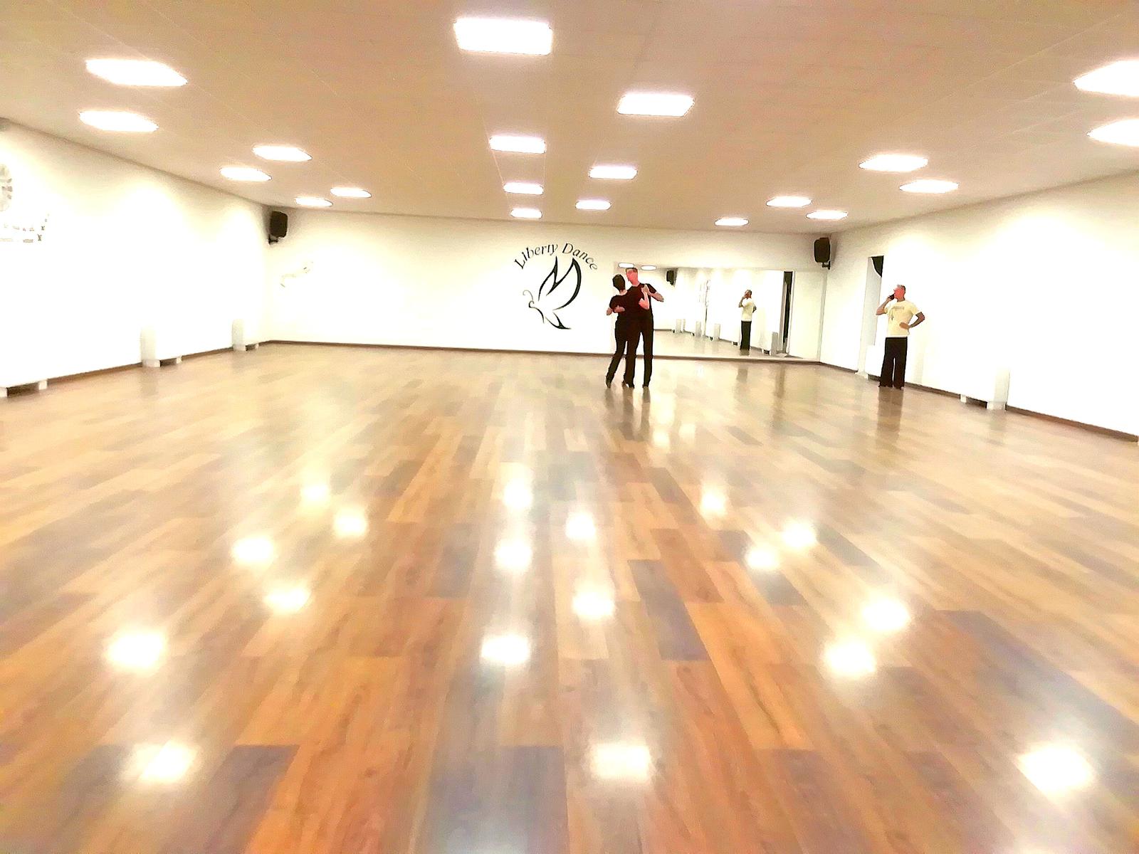 Nel cortile della Scuola di Ballo Liberty a Lauriano ci accoglie il sorriso di Marco, la cui stretta di mano energica e vigorosa è per noi una bella forma sincera di benvenuto. Appena entrati all’interno dei locali, un altro sorriso ci fa capire che siamo davanti a due persone che hanno imparato a rapportarsi nel migliore dei modi con il mondo. Come sempre, questo è il risultato di un processo che passa attraverso la passione, il sacrificio e il sogno. E dopo due passi, ci affacciamo nella grande sala da ballo della scuola e tutto si fa chiaro e comprensibile. Un pavimento tirato a lucido e capace di farci respirare sudore, passione, sacrifici, rinunce e soprattutto sogni. Perché nella scuola di ballo di Tiziana e Marco, i sogni la fanno da padroni. I sogni di questa coppia genuina e semplice, i sogni delle coppie che vengono qui da loro per imparare a ballare, i sogni, lasciatecelo dire, anche nostri, che quelli esaudiamo, oggi ancora di più, quando ci ritroviamo tra le mani una storia carica di sudore. E quando confessiamo questo a Tiziana, lei ci lascia spiazzati: