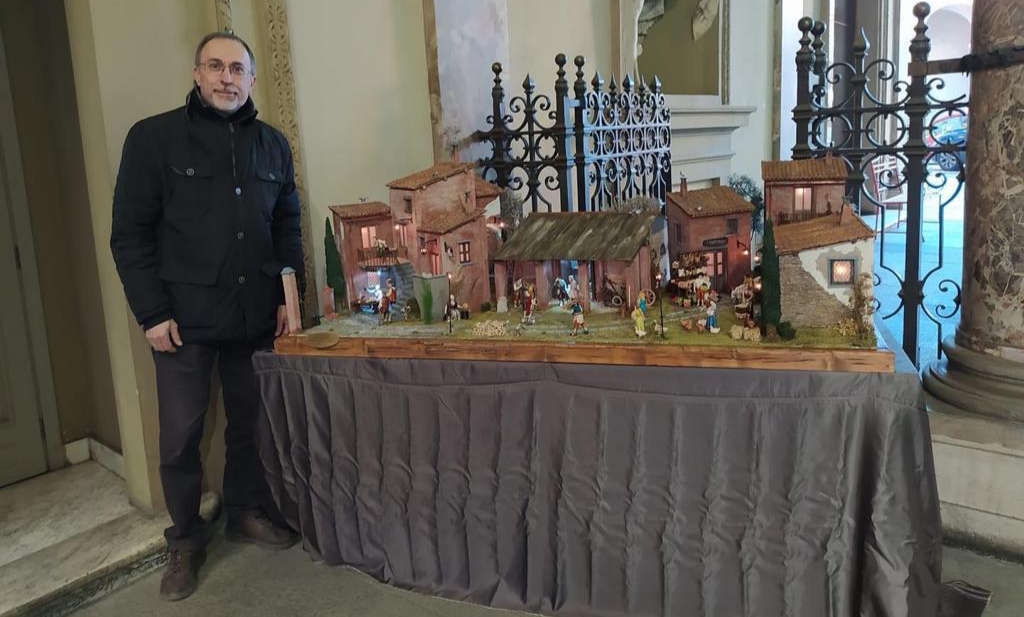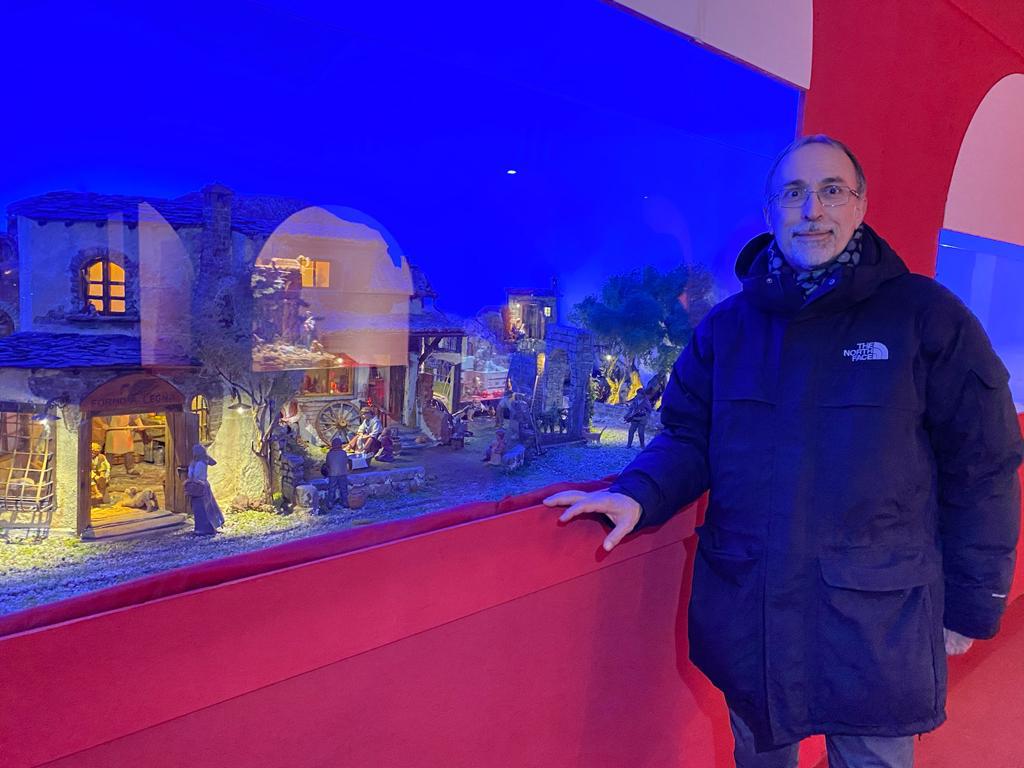 Ermete Benedetti vicino al presepe che ha realizzato per il Consiglio Regionale del Piemonte nel 2021
