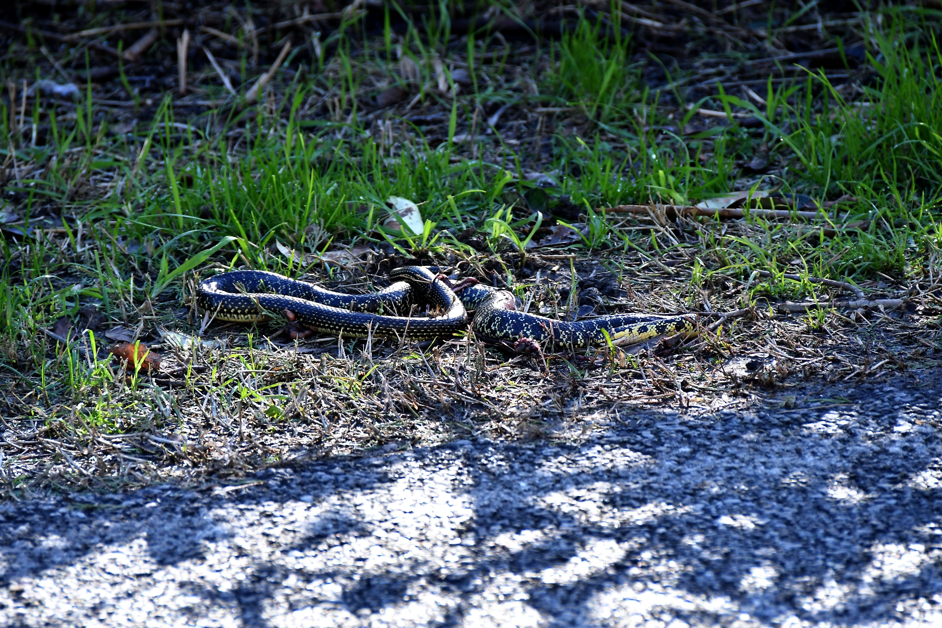 Il rettile, forse rimasto travolto da un'auto mentre attraversava la strada, è ancora riuscito a trascinarsi nel vicino ciglio erboso, ma avrà sicuramente vita breve.