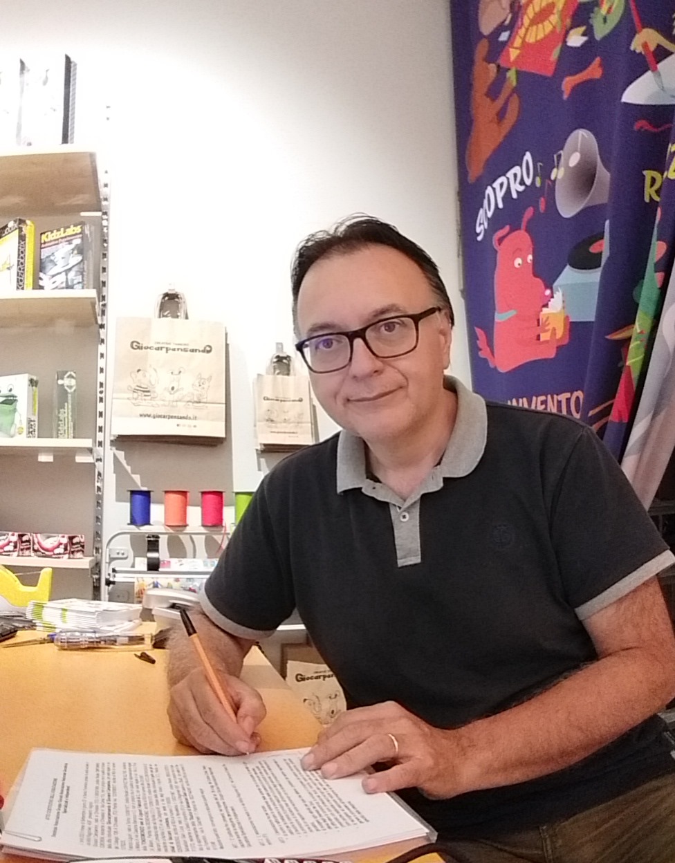 Giovanni Campanino mentre firma per la costituzione di 'Giocaci', Associazione Nazionale negozi di giocattoli indipendenti, di cui è vicepresidente