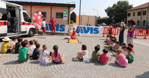 SAN MAURIZIO CANAVESE. Lunedì 14 giugno, in occasione della Giornata del Donatore, l’Avis, con gli amici della Croce Rossa di San Francesco al Campo, hanno incontrato i bimbi della scuola materna Il Giardino Fiorito in piazza degli Agricoltori a Ceretta per spiegare loro l’importanza del defibrillatore che è stato installato recentemente dai volontari della sezione insieme a quello di Malanghero.