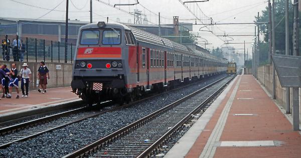 in foto, Treno speciale per i tifosi di Italia90 (partita Brasile-Scozia) in sosta nella appena completata preso la stazione di Rigola Stadio, 20 giugno 1990