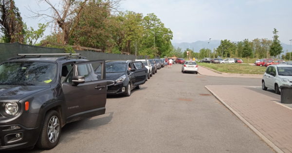 in foto, la lunga coda di auto in attesa del tampone in via Don Sapino
