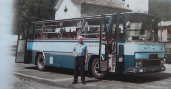 Una fotografia storica di Silvano Comacchio con un autobus della Satti