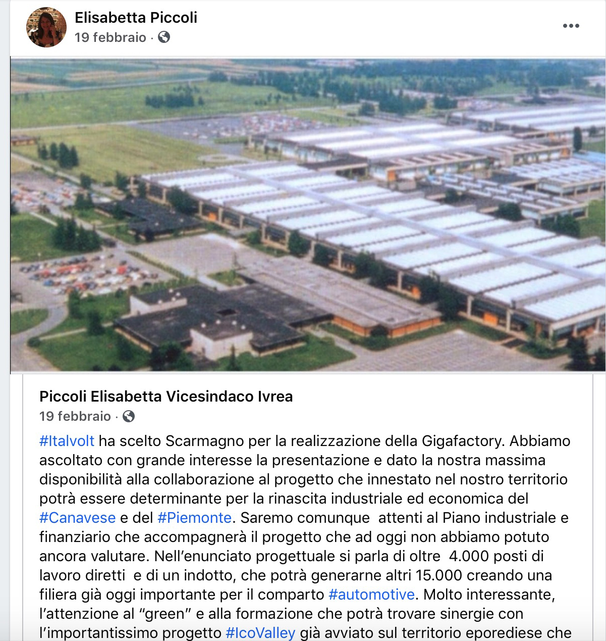 Il post su Facebook con cui la vicesinedaca Elisabetta Piccoli dava notizia del progetto di cui (in verità) aveva appreso l’esistenza dai giornali. Nello stesso post raccontava di un altro progetto, quello di Ico-Valley, sostentendo che fosse già avviato (una balla).