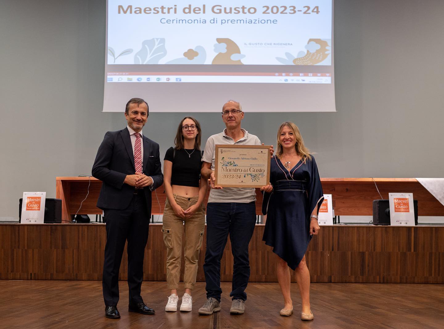Adriano Giovanetto (al centro) alla premiazione Maestri del Gusto, con Dario Gallina (pres. Camera di Commercio Torino) e Barbara Nappini (Slow Food Italia)