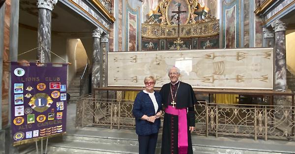 La copia della Sindone di Agliè con la presidente Lions Nella Falletti Geminiani e il Vescovo Monsignor Edoardo Cerrato