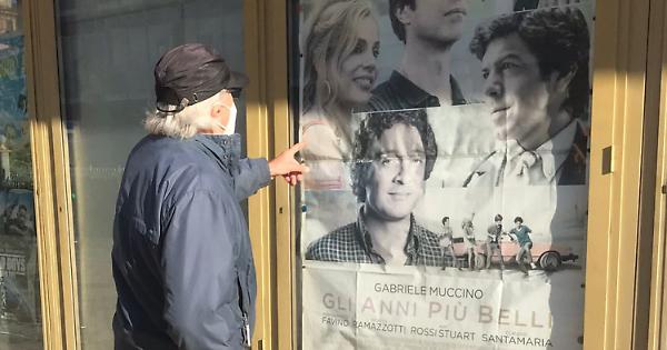 In foto, Mario Beccaris davanti alla locandina dei film in programma il 9 marzo 2020 intitolato "Gli anni più belli"