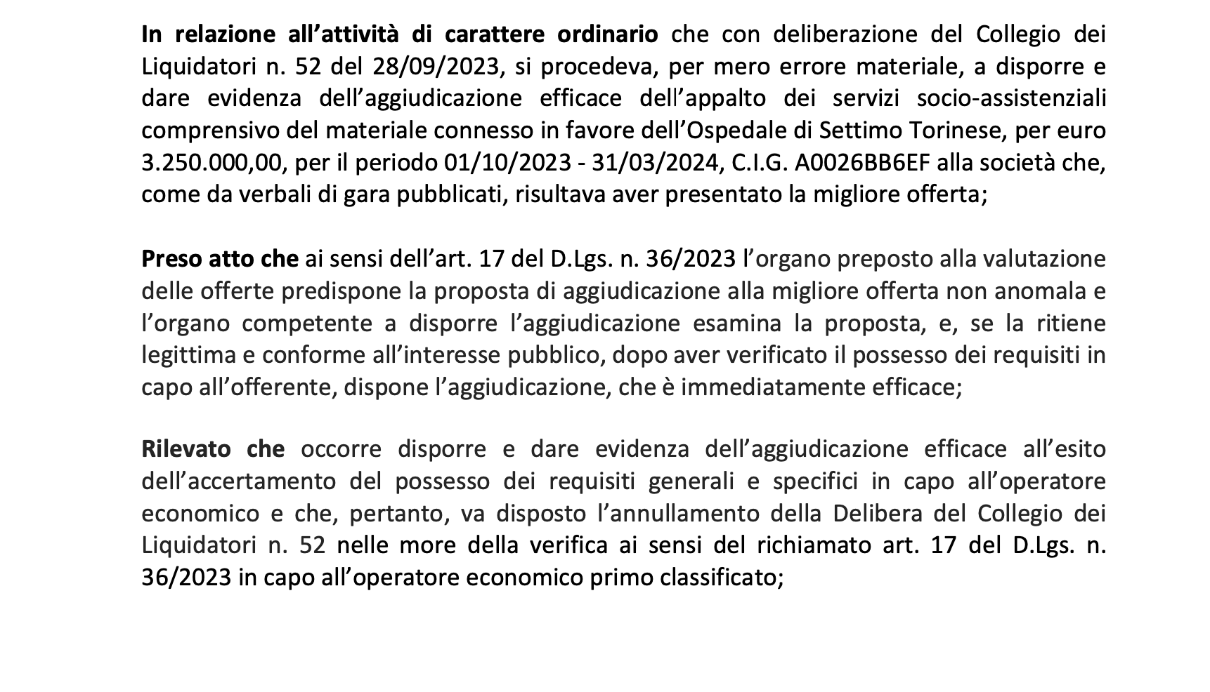 In relazione all’attività di carattere ordinario che con deliberazione del Collegio dei Liquidatori n. 52 del 28/09/2023, si procedeva, per mero errore materiale, a disporre e dare evidenza dell’aggiudicazione efficace dell’appalto dei servizi socio-assistenziali comprensivo del materiale connesso in favore dell’Ospedale di Settimo Torinese, per euro 3.250.000,00, per il periodo 01/10/2023 - 31/03/2024, C.I.G. A0026BB6EF alla società che, come da verbali di gara pubblicati, risultava aver presentato la migliore offerta;