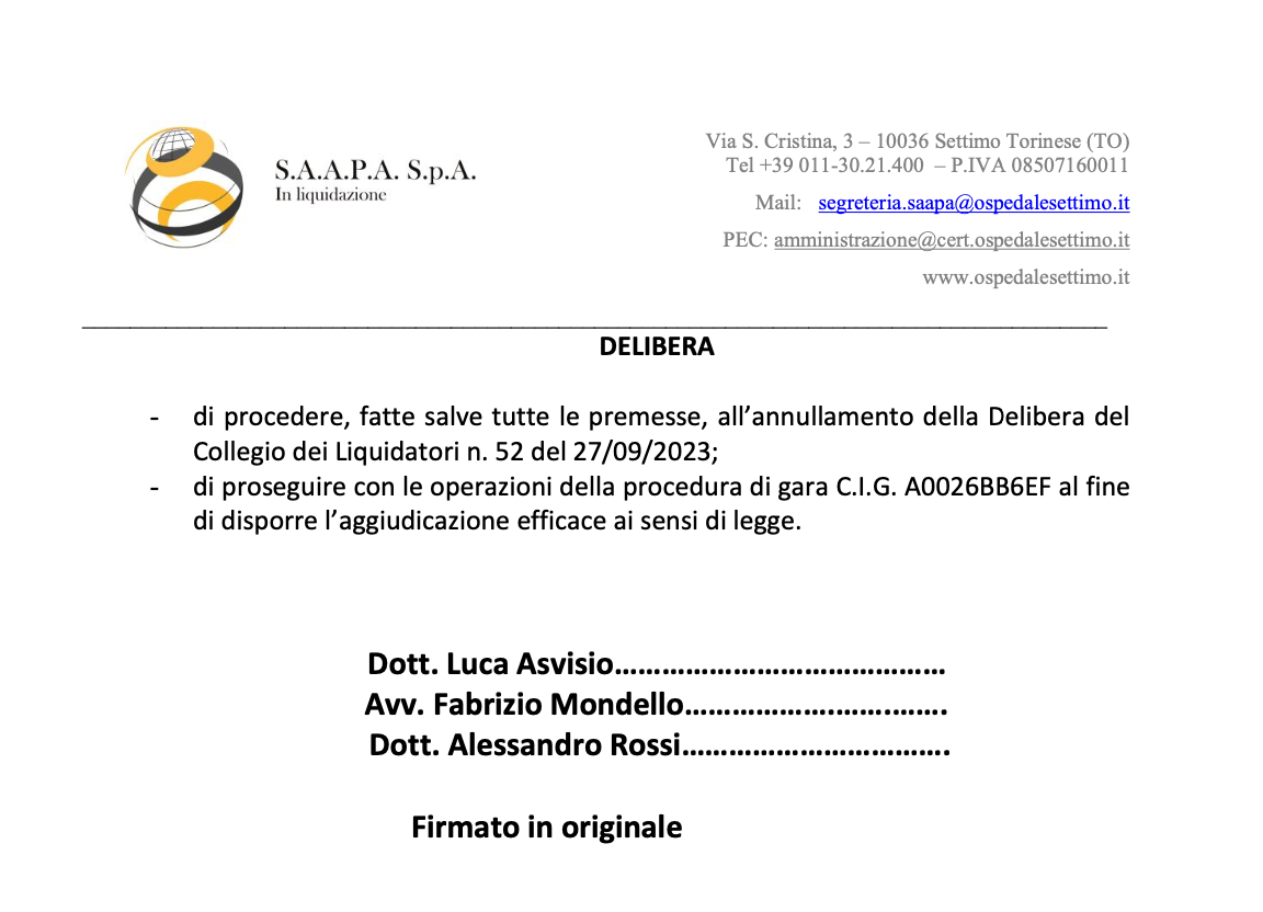 In realtà, come chiaramente indicato nella Deliberazione n. 53/2023, S.A.A.P.A. S.p.a. ha unicamente proceduto ad annullare la precedente Deliberazione n. 52 del 28/09/2023 nella quale, per mero errore materiale, era stata data evidenza dell’aggiudicazione efficace dell’appalto in favore della CM Service, ossia della Società che, come da verbali di gara pubblicati, ha presentato la migliore offerta.