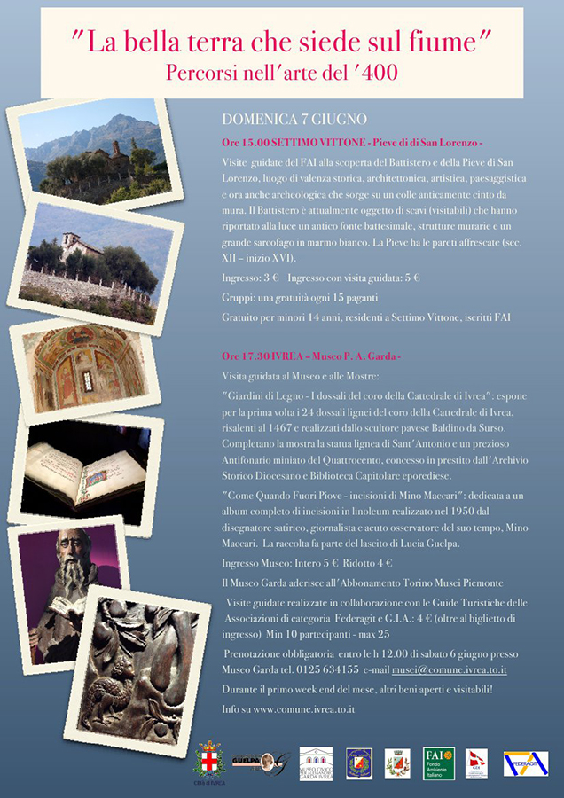 Tra gli altri eventi da segnalare domenica 7 giugno l’iniziativa “La Bella terra che siede sul fiume – percorsi nell’arte del ‘400” che prevede alle ore 15.00 visite guidate del FAI alla scoperta del Battistero e della Pieve di San Lorenzo a Settimo Vittone (Ingresso: 3 € Ingresso con visita guidata: 5 € Gruppi: una gratuità ogni 15 paganti Gratuito per minori 14 anni, residenti a Settimo Vittone, iscritti FAI). Alle ore 17.30 visita guidata al Museo P. A. Garda di Ivrea e alle Mostre: "Giardini di Legno - I dossali del coro della Cattedrale di Ivrea" e "Come Quando Fuori Piove - incisioni di Mino Maccari". Prenotazione obbligatoria entro le h 12.00 di sabato 6 giugno presso Museo Garda tel. 0125 634155, e-mail musei@comune.ivrea.to.it .