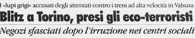 I media si scatenano. I 3 diventano “ecoterroristi” e le prime pagine sono tutte per loro. «I Lupi grigi presi nei centri sociali – Lunga indagine con un infiltrato, sequestrate bombe e micce», «Squatters anarchici con la passione delle armi» (La Stampa), «Fermati tre sovversivi – Una pista sugli attentati anti-Tav in Val Susa» (La Repubblica). Le fantomatiche armi e bombe non verranno mai trovate.