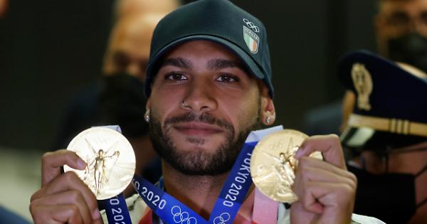 MARCELL JACOBS AL RIENTRO IN ITALIA DOPO AVER VINTO DUE ORI ALLE OLIMPIADI DI TOKIO 2020