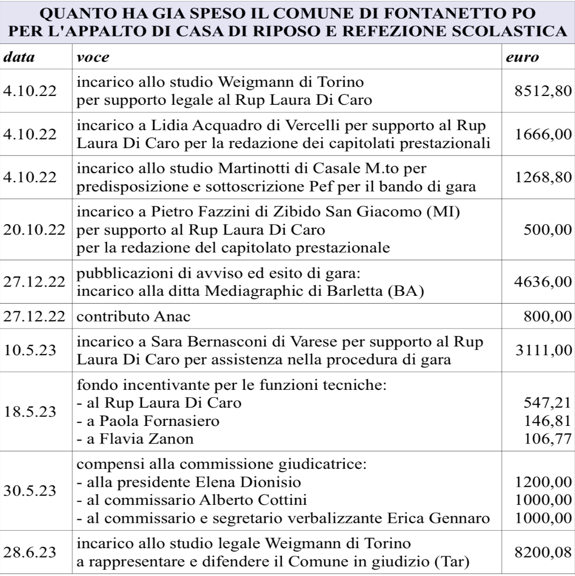 Spiega il sindaco Riccardo Vallino: «Nella prima fase di accesso al bando, pare che la cooperativa non abbia presentato un documento fondamentale: una svista che è costata l’esclusione dalla gara d’appalto. Ma in questa fase di selezione il Comune non ha alcun ruolo». La non ammissibilità della cooperativa “Punto Service” è stata infatti decisa dalla Stazione Unica Appaltante, costituita tra i Comuni di Fontanetto Po e Saluggia, nel corso della fase di esame delle buste.