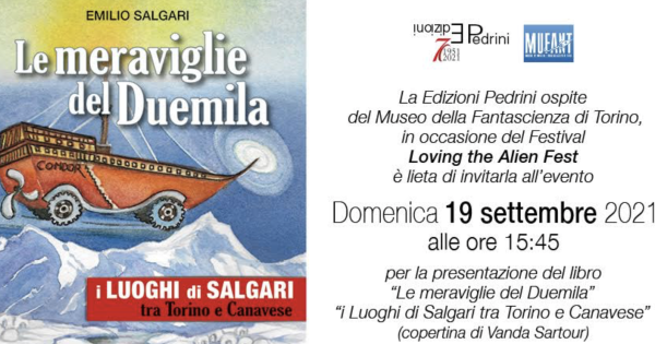 Il museo torinese dedicato al fantastico e alla fantascienza (Mu.Fant), ospiterà domenica 19 settembre alle ore 15.45, all'interno dell'evento “Loving the Alien Fest 2021”, la Edizioni Pedrini che presenterà ufficialmente, nella sezione dedicata a: “Omaggio a Emilio Salgari” (in occasione dei 110 anni dalla morte del grande romanziere), un talk tra Massimo Centini, l'autore del saggio iniziale “I luoghi di Salgari tra Torino e il Canavese” e la riedizione del romanzo “Le meraviglie del 2000” di Emilio Salgari e l'esperto e studioso dei testi di Salgari, Felice Pozzo. Alla presentazione, ad ingresso libero, Centini e Pozzo racconteranno un Emilio Salgari poco conosciuto che va al di là dello stereotipo comune dei suoi classici personaggi televisivi e cinematografici apprezzati dal grande pubblico.