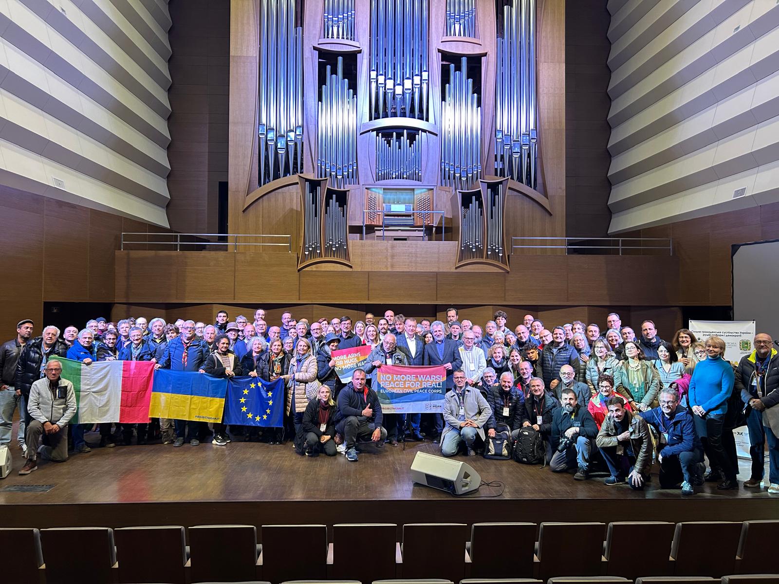 Davanti al maestoso organo della sala, uniti dai colori della pace: italiani, europei e ucraini insieme per dire “No more wars!”.