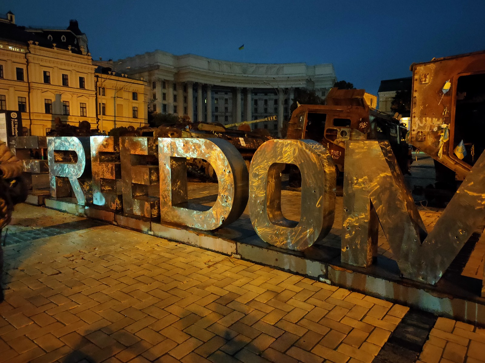 “Freedom”, libertà. Una parola di metallo che risplende tra le rovine, come un grido che resiste alla notte.