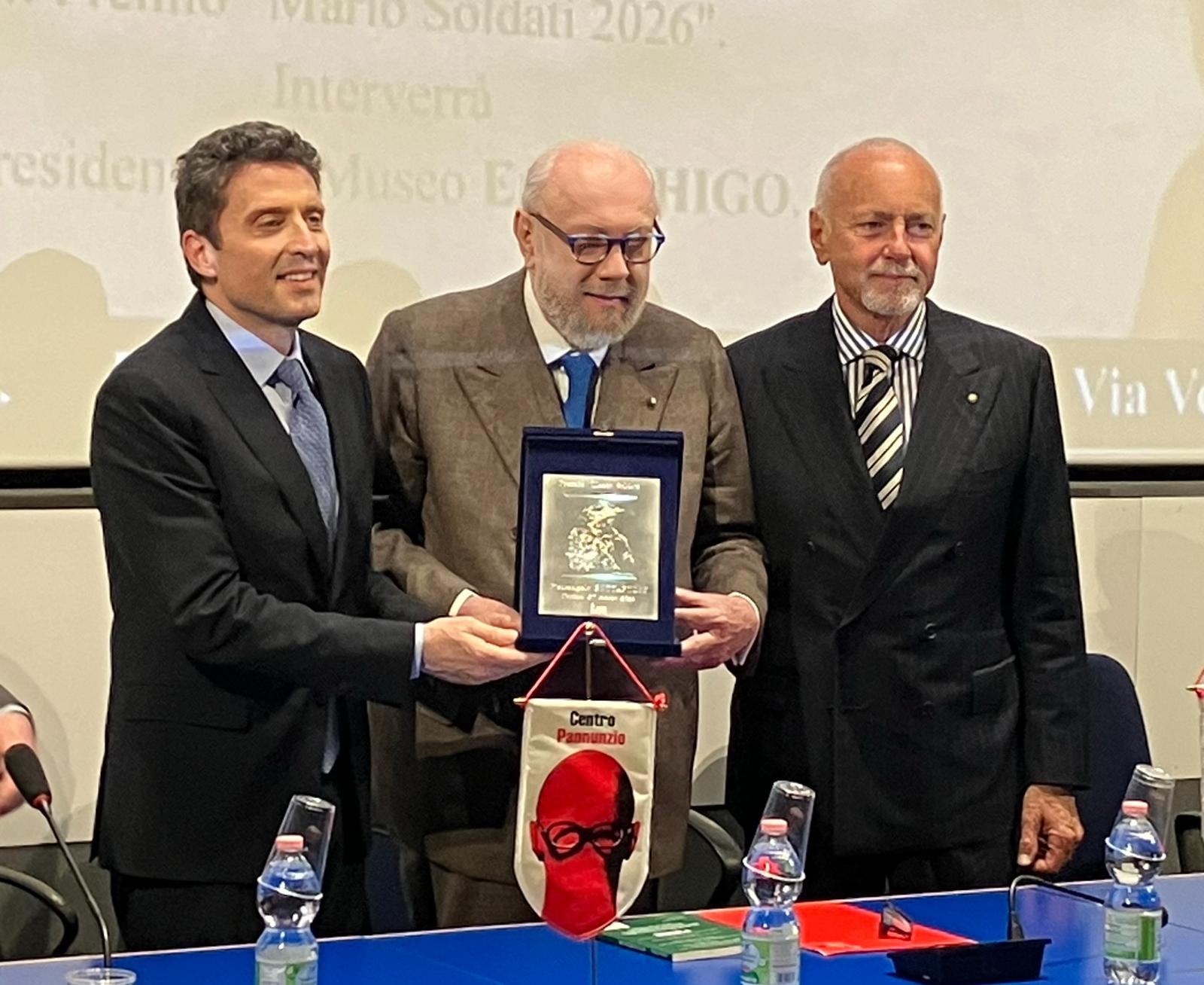 Pietrangelo Buttafuoco riceve il Premio Mario Soldati 2026. Con lui, Pier Franco Quaglieni, presidente del Centro Pannunzio, ed Enzo Ghigo, presidente del Museo Nazionale del Cinema.