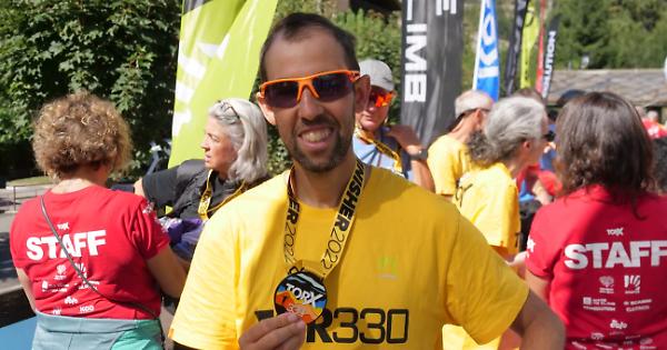 Massimo Scuccato sorride orgoglioso con la medaglia di finisher del TOR330