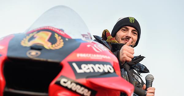 Il campione del mondo della MotoGp Francesco Bagnaia e il suo nuovo compagno di squadra Enea Bastianini questa mattina dalle nevi di Madonna di Campiglio hanno tolto i veli alla nuova Ducati Desmosedici che parteciperà al Mondiale di MotoGP 2023.
