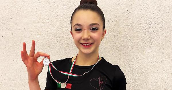 Matilde Monaco mostra la medaglia d'argento conquistata in pedana