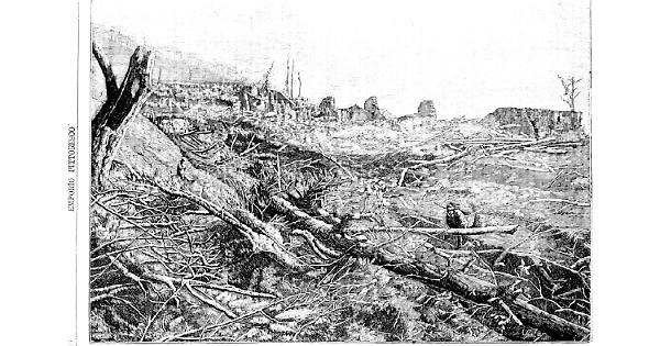 Il paese di Valprato (Ivrea) distrutto da una valanga. Stampa tratta da Emporio pittoresco del marzo 1888 (Collezione B. Bellino, Cuorgné)