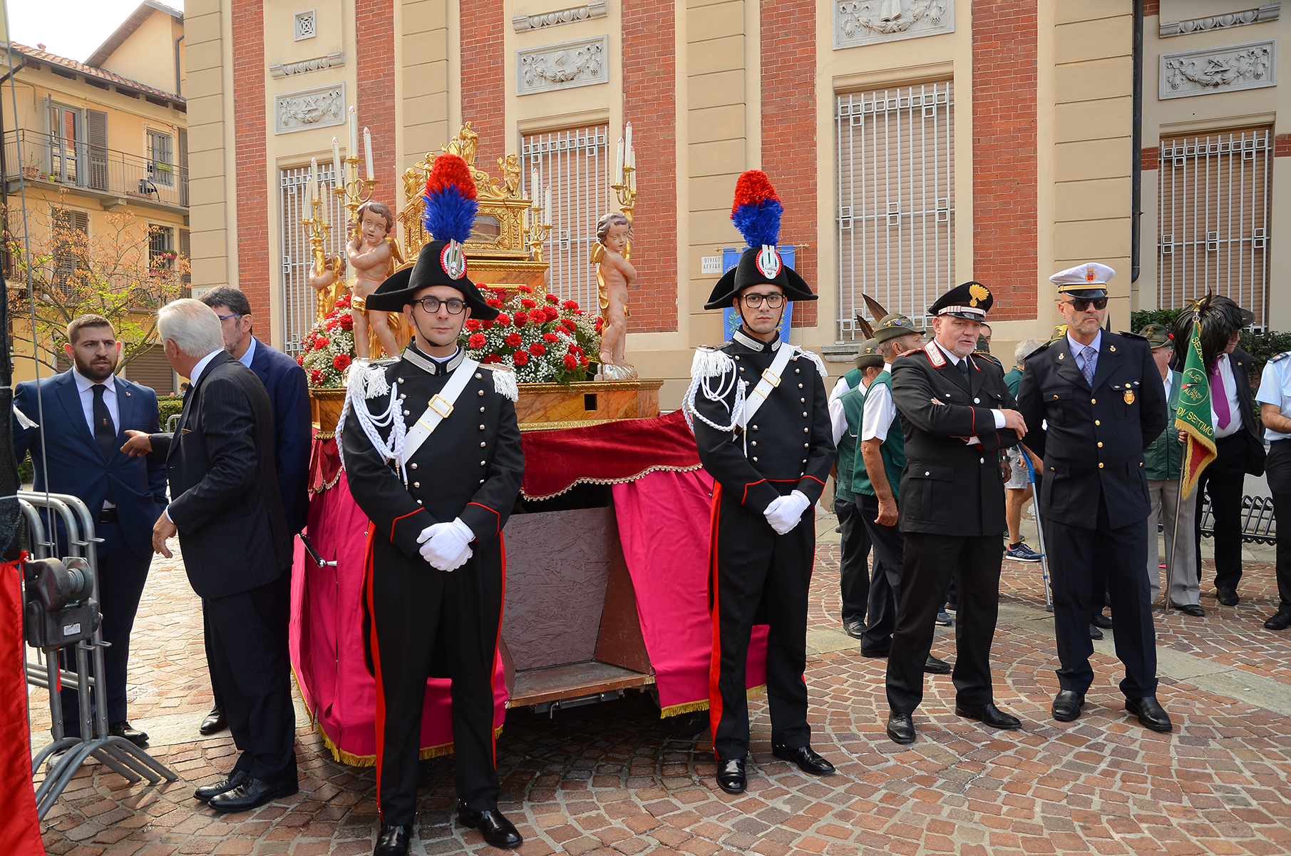Il cuore della ricorrenza fu sempre costituito dalla processione con le reliquie dei patroni. Per secoli, la ricorrenza religiosa costituì un momento unificante nella vita della collettività. Tutti si riconoscevano nel comune patrimonio di fede, nei valori, nelle tradizioni e nei simboli a esso intimamente legati. A tale proposito, significativa è una vecchia deliberazione del consiglio comunale. I rappresentanti della comunità dichiararono che non si dovevano assolutamente «minuire li apparati alla chiesa et altre decorose funzioni in onore de Santi Martiri», tanto più che, quell’anno, il territorio di Settimo aveva «ricevuto particolarissima grazia [...] di una copiosa pioggia miracolosamente caduta [...] in tempo di siccità immensa». Pertanto, al fine di «impegnar detti Santi Martiri a continuare la di loro propensione verso» i settimesi, era opportuno «accrescere et abbondare a tutta forza nella solennizzazione» della festa. Correva l’anno 1739.