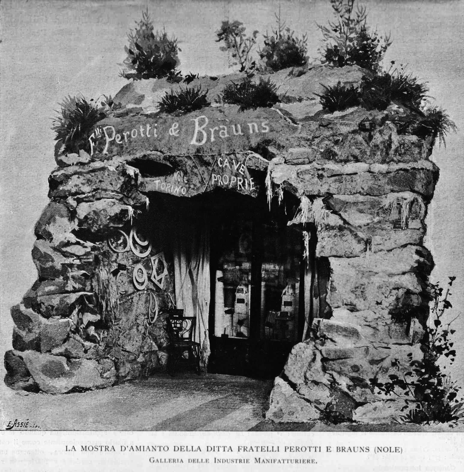 Ma ora soffermiamoci in particolare sulla Ditta Perotti e Brauns di Nole che, nella Galleria delle Industrie Manifatturiere, presentò i suoi prodotti entro una cava di roccia amiantifera. In essa erano esposti campioni di tutto quanto si fabbricava con le fibre di questa pietra: carte e cartoni, filati, trecce e corde, tessuti ed abiti interi. Un lungo articolo apparso sul numero 17 del giornale illustrato “L’Esposizione nazionale” trattava l’argomento in modo dettagliato. Nel 1898 lo si magnificava quale prodotto prodigioso e innovativo da utilizzare in vari campi industriali. Oggi un processo che si sta svolgendo a Torino pone d’innanzi a tutti la tragica sorte di oltre 2000 vittime colpite da mesotelioma e asbestosi e le responsabilità di chi nei decenni passati forse ormai sapeva, ma non si è adoperato a sufficienza perché tutto ciò non avvenisse.