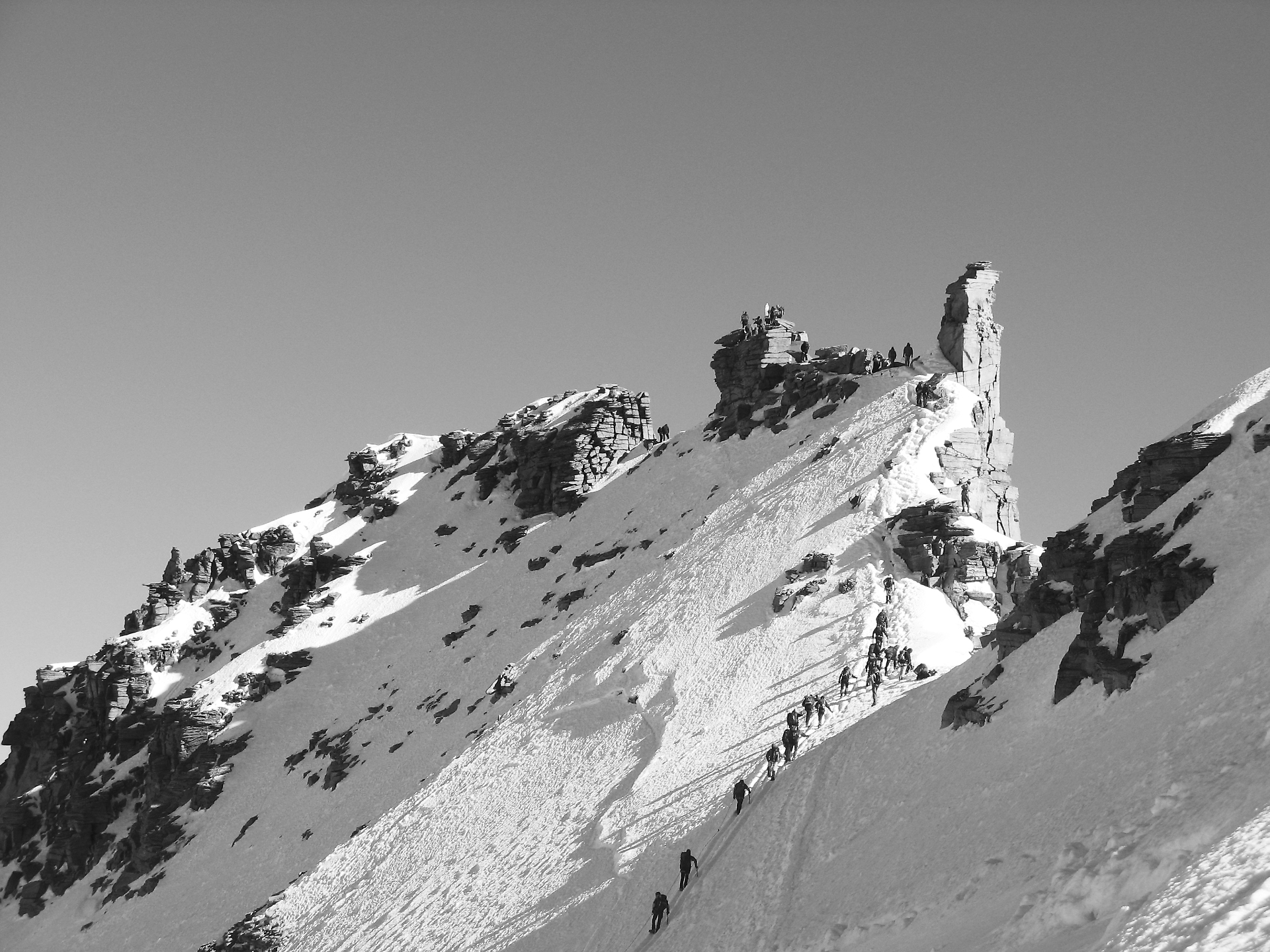 Nel frattempo il cielo si è fatto limpido, ma la temperatura è molto bassa, aggravata da un forte vento da N-E. Decidono di legarsi, anche se Tairraz ha qualche dubbio in merito (a quell’epoca le tecniche di progressione in cordata erano alquanto primitive). La scelta si dimostra felice quando proprio Tairraz, nel superamento della terminale, scivola giù per il pendio, ma viene trattenuto senza difficoltà da Dundas.