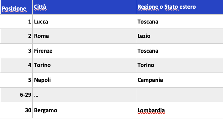 Oltre alle grandi città estere appena menzionate, anche tra quelle nostrane prevalgono i grandi centri. Tra le poche eccezioni c’è, tuttavia, proprio la città prima classificata