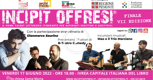 Dopo 18 tappe in 5 regioni – Piemonte, Lombardia, Liguria, Valle d’Aosta, Lazio – si conclude a Ivrea, Capitale Italiana del Libro 2022, nella ex Chiesa Santa Marta, la sfida a colpi di incipit del primo talent letterario itinerante dedicato agli aspiranti scrittori. A condurre l’incontro, vero e proprio spettacolo di intrattenimento, gli attori di B-Teatro Comedy con la partecipazione straordinaria di Gianmarco Saurino, l’attore della serie tv “Doc”, e le incursioni musicali di Mao e il Trio Marciano. Incipit Offresi è ideato e promosso dalla Fondazione ECM - Biblioteca Archimede di Settimo Torinese, in sinergia con Regione Piemonte. L’obiettivo non è premiare il romanzo inedito migliore, ma scovare nuovi talenti. In 6 anni Incipit Offresi ha scoperto più di 40 nuovi autori, pubblicato 60 libri e coinvolto più di 10mila persone, 30 case editrici e più di 50 biblioteche e centri culturali. Incipit Offresi è un vero e proprio talent della scrittura, lo spazio dove tutti gli aspiranti scrittori possono presentare la propria idea di libro, incontrare e dialogare con gli editori coinvolti nelle varie fasi del progetto.