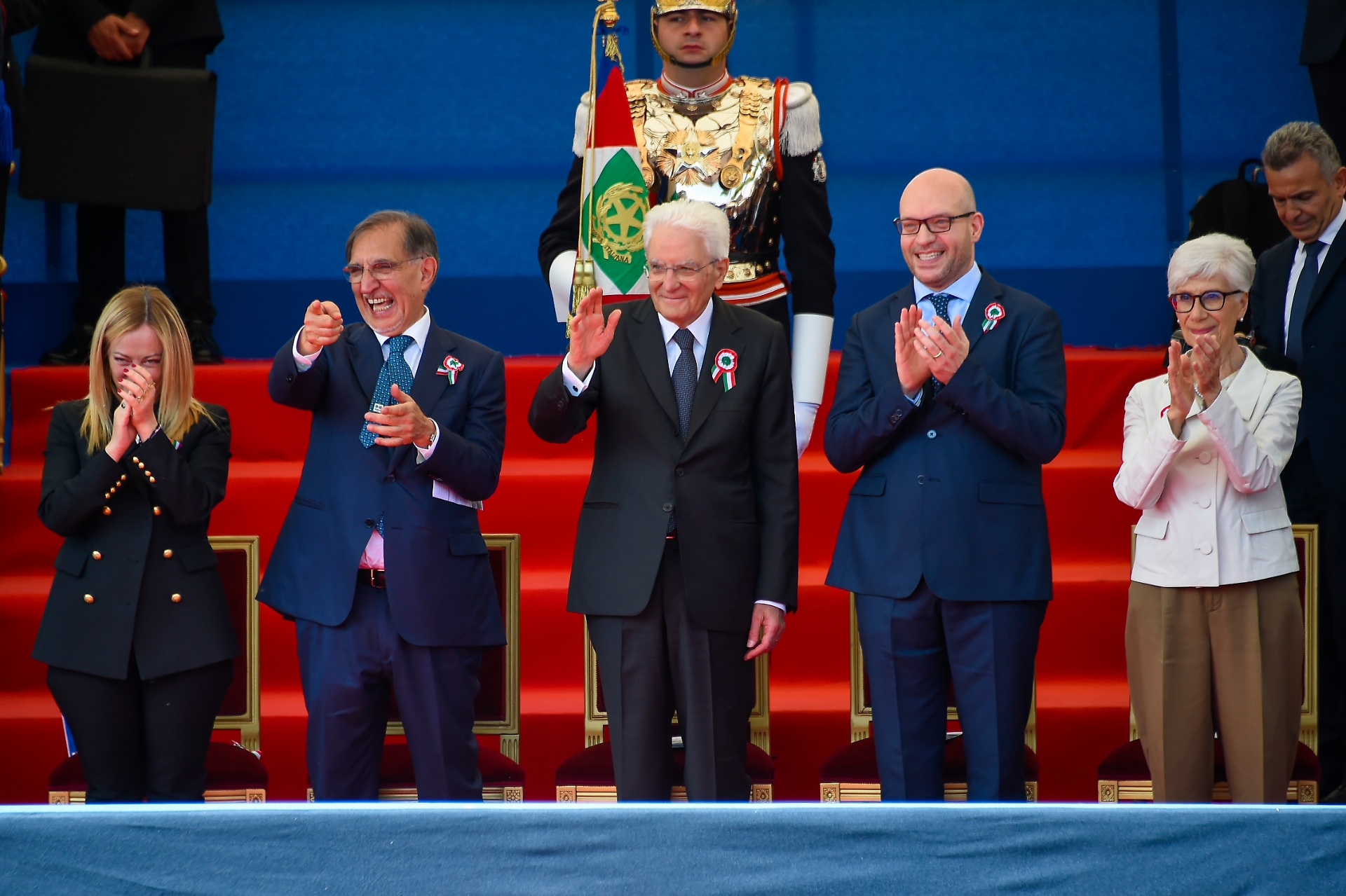 Non è peraltro una novità di quest'anno: anche nelle edizioni precedenti della parata ai Fori la compagnia ha scandito il motto passando sotto la tribuna delle autorità. Interviene anche il presidente dei senatori di Fratelli d'Italia, Lucio Malan.
