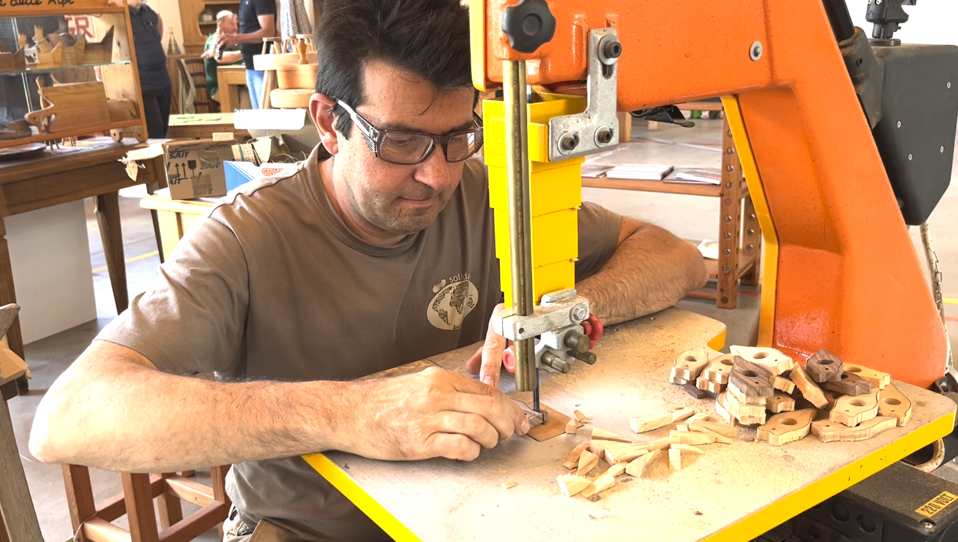Lo incontriamo mentre intaglia un pezzo di legno disegnato con una maestria e una sicurezza che parlano da sole. Fa passare il pezzo di legno attraverso una sega elettrica e lo modella in una forma sinuosa. Alla Fiera dell'Artigianato di Cantoira Enrico Brunati è tra gli espositori che più attirano l'attenzione degli avventori.