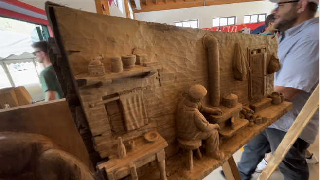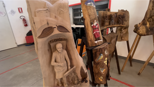Una folla di personaggi intagliati nel legno siedono attorno allo stand di Luciano Dall'Angelo, scultore. Lui ci tiene a precisarlo: "Sono solo un hobbysta!". Ma la qualità delle sue opere è altissima, e i personaggi raffigurati riportano la mente a un'altra epoca. In quelle scene di vita quotidiana incarnate nel legno prendono vita le Valli di Lanzo per com'erano cinquant'anni fa.