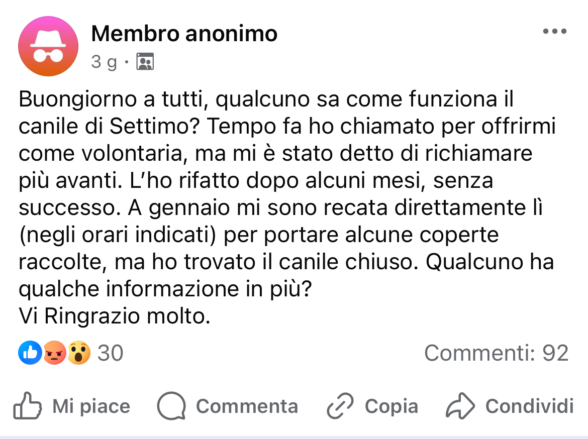 Il dibattito è esploso a partire da un post sul gruppo Facebook "Sei di Settimo se...", dove una cittadina ha denunciato pubblicamente la sua esperienza negativa con il canile: "Buongiorno a tutti, qualcuno sa come funziona il canile di Settimo? Tempo fa ho chiamato per offrirmi come volontaria, ma mi è stato detto di richiamare più avanti. L’ho rifatto dopo alcuni mesi, senza successo. A gennaio mi sono recata direttamente lì (negli orari indicati) per portare alcune coperte raccolte, ma ho trovato il canile chiuso. Qualcuno ha qualche informazione in più?".