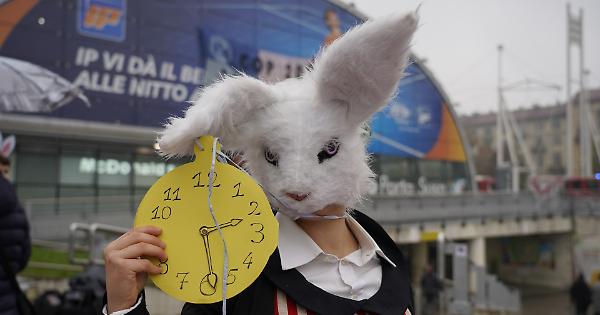 Lo striscione si srotola rapidamente, ben visibile da corso Inghilterra, mentre i pendolari che attraversano la piazza rallentano, alzano lo sguardo, cercano di capire cosa stia accadendo. Sotto, sul marciapiede, un piccolo presidio di attivisti accoglie i passanti. Tengono in mano volantini, parlano con studenti e lavoratori, cercano di spiegare – per l'ennesima volta – che non si tratta di allarmismo, ma di semplice matematica climatica. Tra di loro, però, c’è anche un elemento surreale: una persona travestita da Bianconiglio, quello di Alice nel Paese delle Meraviglie, che periodicamente guarda un orologio e borbotta “È tardi, è tardi”. Una scena che strappa un sorriso amaro: perché di tardi, per gli attivisti, lo è davvero.