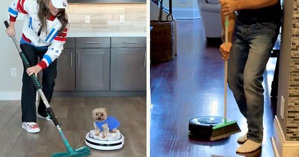 C’è poi il video che sembra raccontare una coppia in azione sull’account @theitalianduetto: un uomo in calzini utilizza un mocho per pulire il parquet mentre una ragazza spinge progressivamente in avanti il secchio, simulando il lancio della pietra. Il risultato è una coreografia involontaria che riprende in modo sorprendentemente fedele dinamiche e movimenti dello sport olimpico.