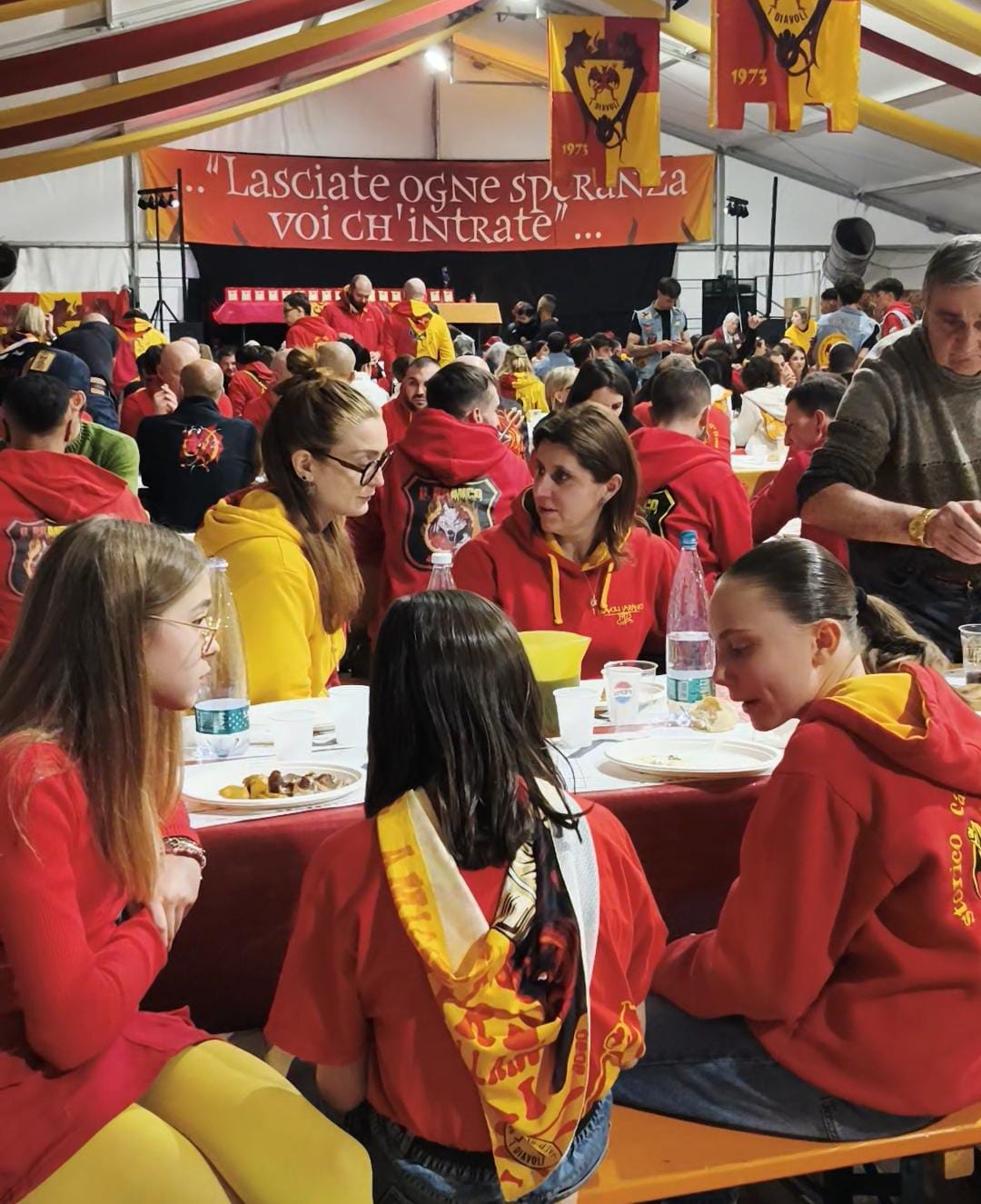 Tavolate immense riempiono lo spazio, generazioni diverse sedute fianco a fianco. I bicchieri si alzano, la birra scorre a fiumi, la musica rimbomba sotto il tendone. E poi il coro, potente, che si alza compatto:“Diavoli alè! Diavoli alè!”