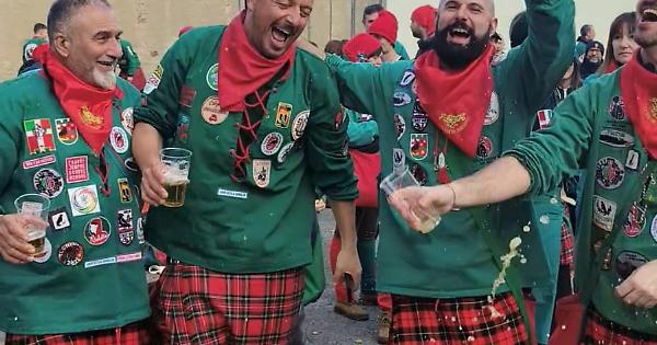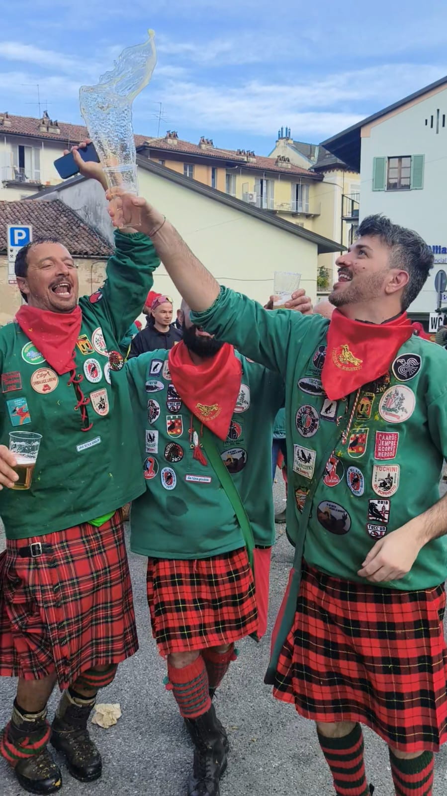 Li incontriamo nel bel mezzo della battaglia delle arance. I kilt svolazzano, qualcuno ha in mano una birra, e subito la festa esplode. Si saltella, si canta, si battono tamburi e mani. È impossibile non unirsi al coro: "In mezzo passa il fiume,