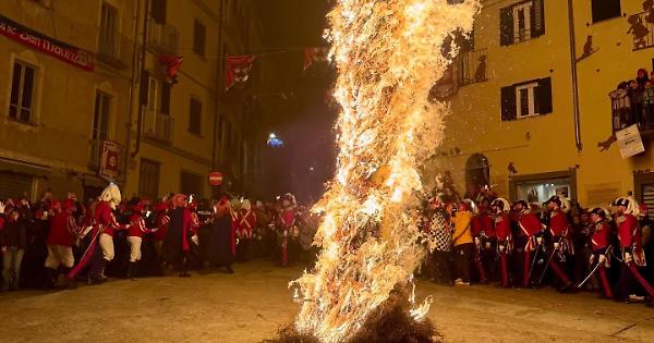 Alle 21.30 Piazza di Città è gremita. Lo Scarlo della Parrocchia di San Salvatore attende il fuoco. Accanto, la Vezzosa Mugnaia Valentina Campesato in Mantovani, simbolo di libertà e orgoglio popolare, è presente come in ogni momento decisivo. Le fiamme si alzano rapide, divorano il palo e il pagliericcio con un crepitio che rompe il silenzio. Gli sguardi sono tutti rivolti lì, verso quel falò che non è soltanto legna che brucia, ma un anno che si consuma per lasciare spazio al prossimo. Se lo Scarlo cade in avanti, è segno di buon auspicio. La folla trattiene il respiro, poi esplode in un applauso liberatorio. È un attimo, ma vale un inverno intero.