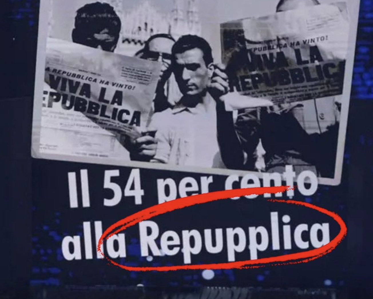 Nel frattempo, alle spalle del palco dell’Ariston, compare anche la prima gaffe grafica del Festival. Sul ledwall, mentre si ricorda il risultato del referendum, appare la scritta: “Il 54 per cento alla Repupplica”. Due “p” di troppo trasformano la Repubblica in “Repupplica”. L’errore resta visibile per diversi secondi durante l’intervista, diventando immediatamente virale. Un refuso che stride proprio nel momento in cui si celebra la nascita della Repubblica e che contribuisce a rendere la scena ancora più commentata.