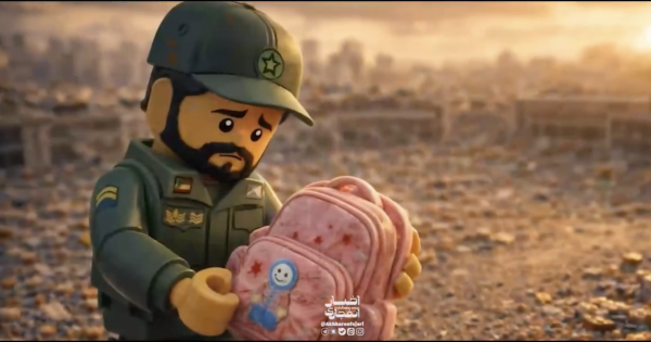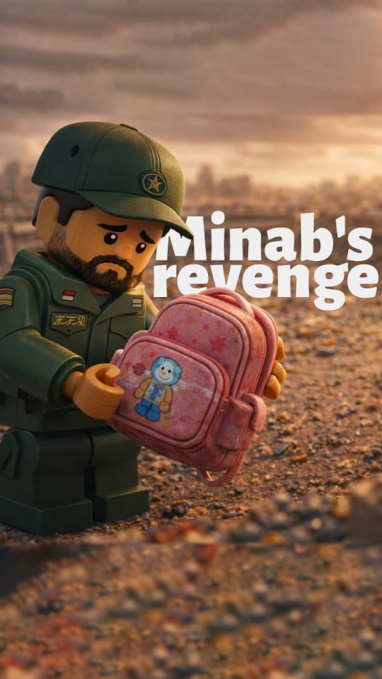 La narrazione prosegue con la rappresentazione della risposta iraniana. Un funzionario della Repubblica islamica, sempre in versione Lego, raccoglie lo zainetto di una delle vittime e piange. La tristezza si trasforma rapidamente in rabbia e dà il via alla controffensiva.