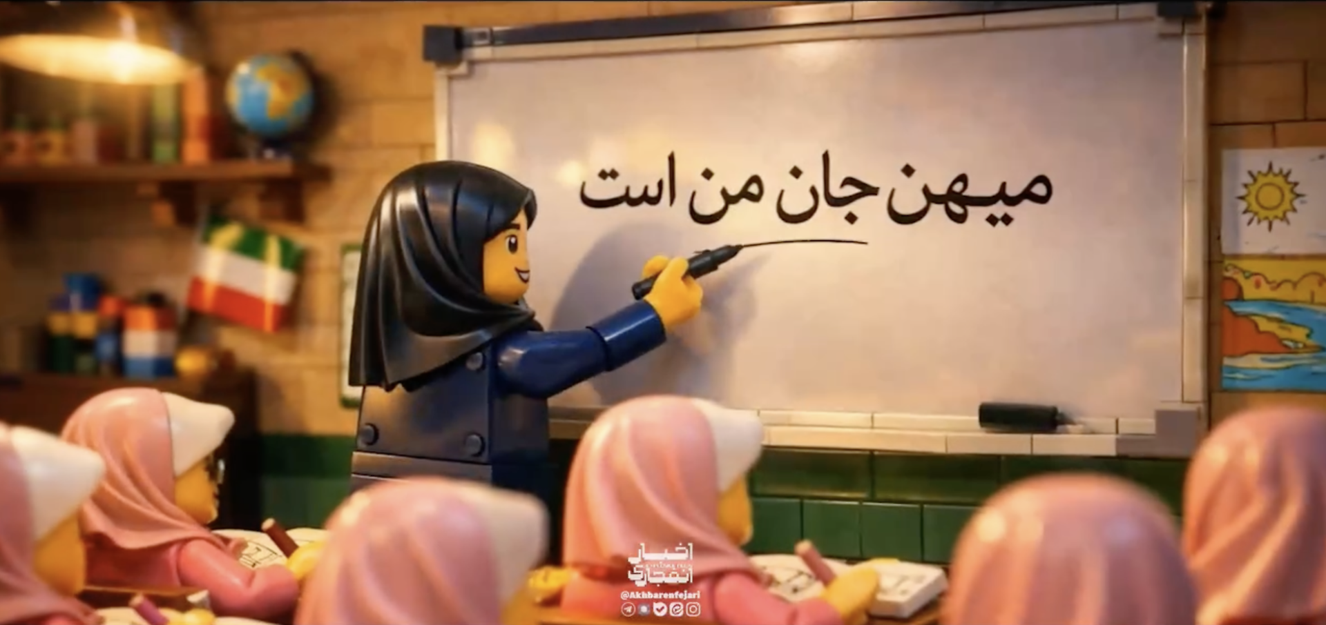 Il missile con la bandiera americana attraversa il cielo e la scena cambia improvvisamente tono. Il video mostra un’aula scolastica iraniana: una maestra insegna davanti a una classe di bambine con il velo rosa. Le studentesse rappresentano le 150 vittime del bombardamento che ha colpito la scuola elementare Shajareh Tayyebeh di Minab, nel sud dell’Iran.